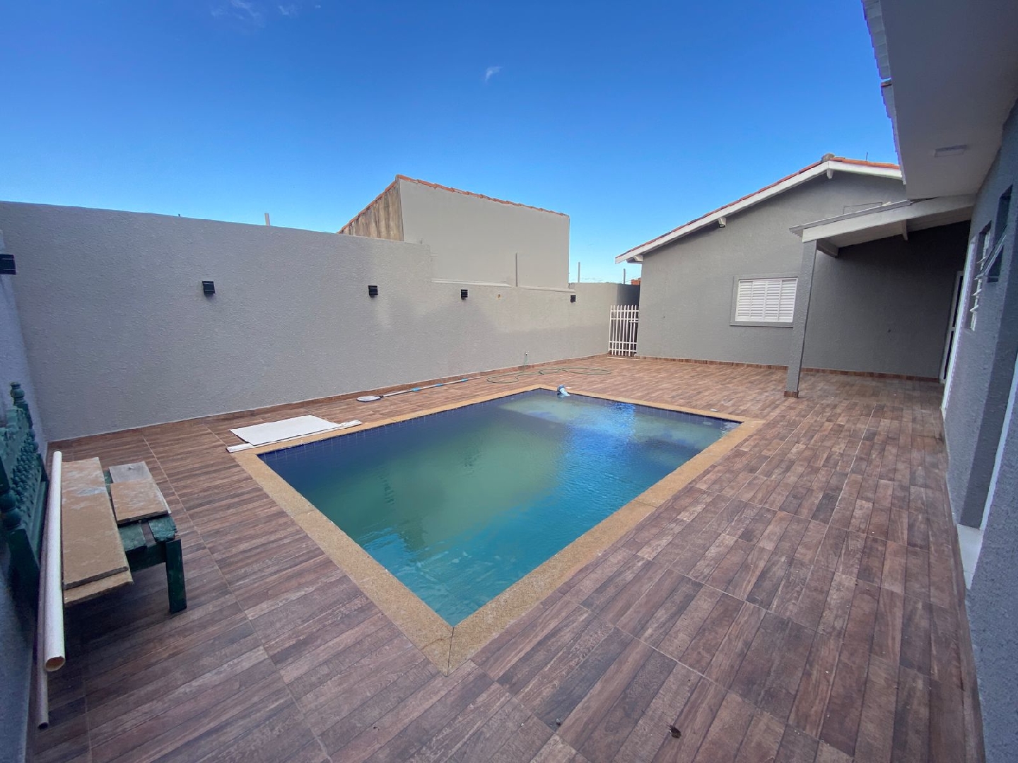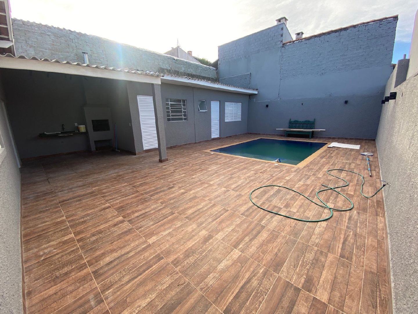 Imóvel: Com garagem coberta para até 4 carros, sala de estar, Sala de jantar, área de serviço, WC Social e 2 dormitórios suítes. Edícula com área de lazer com churrasqueira, 2 dormitórios e WC Social, quintal com piscina. Portão automático e interfone, sala de estar com ventilador de teto.