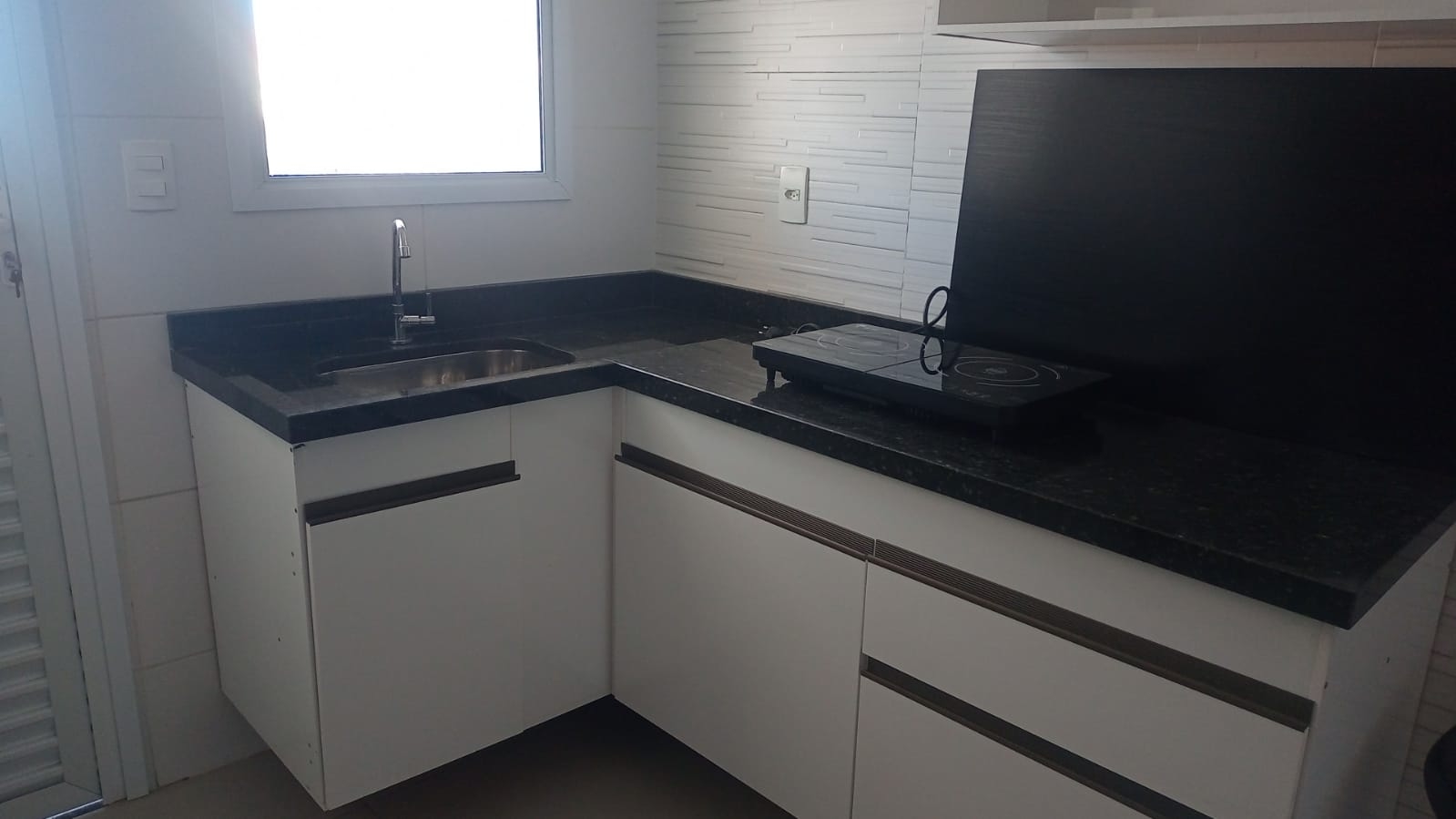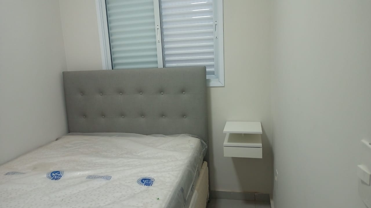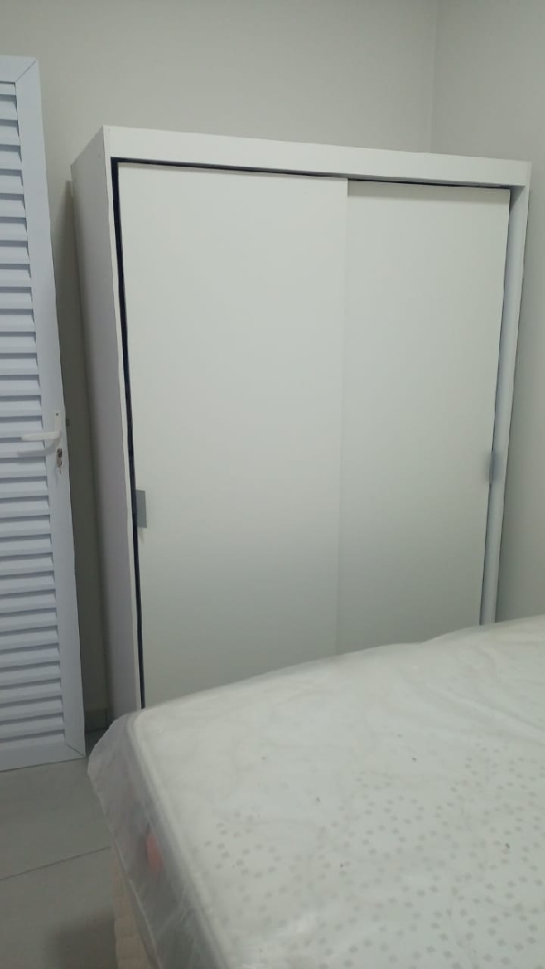 Com fogão cootop,armário aereo,cama c/ cabeceira,criado mudo e guarda-roupa.