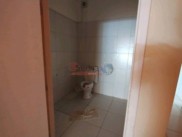 Salão comercial com banheiros, laje e piso frio.